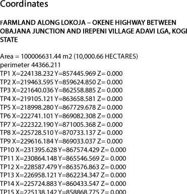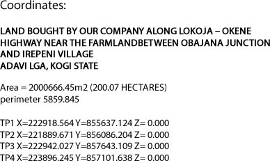 Project Site Description: The land holding of the project is 10,000hectares between Obajana Junction and Irepeni Village in Adavi LGA of Kogi State. The site situated along Okene – Lokoja Highway at about 20 kilometres from Lokoja and about 200 kilometres to Abuja, the FCT. The trunk A (Federal) Highway that links Okene-Lokoja-Abuja is fairly of good quality tarred road.